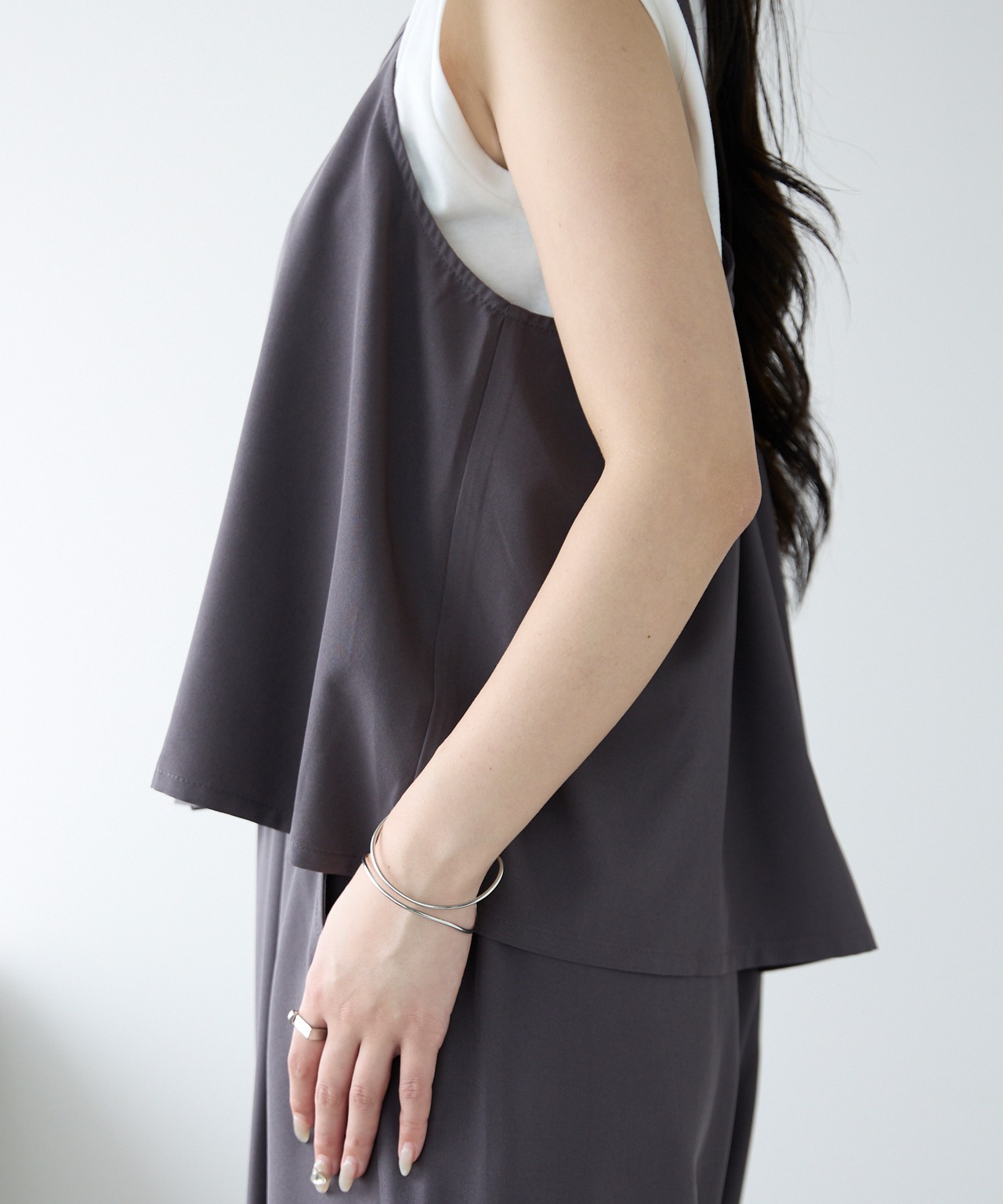 シンプルなキャミソールは裾がフレアシルエットになっており女性らしい印象に。