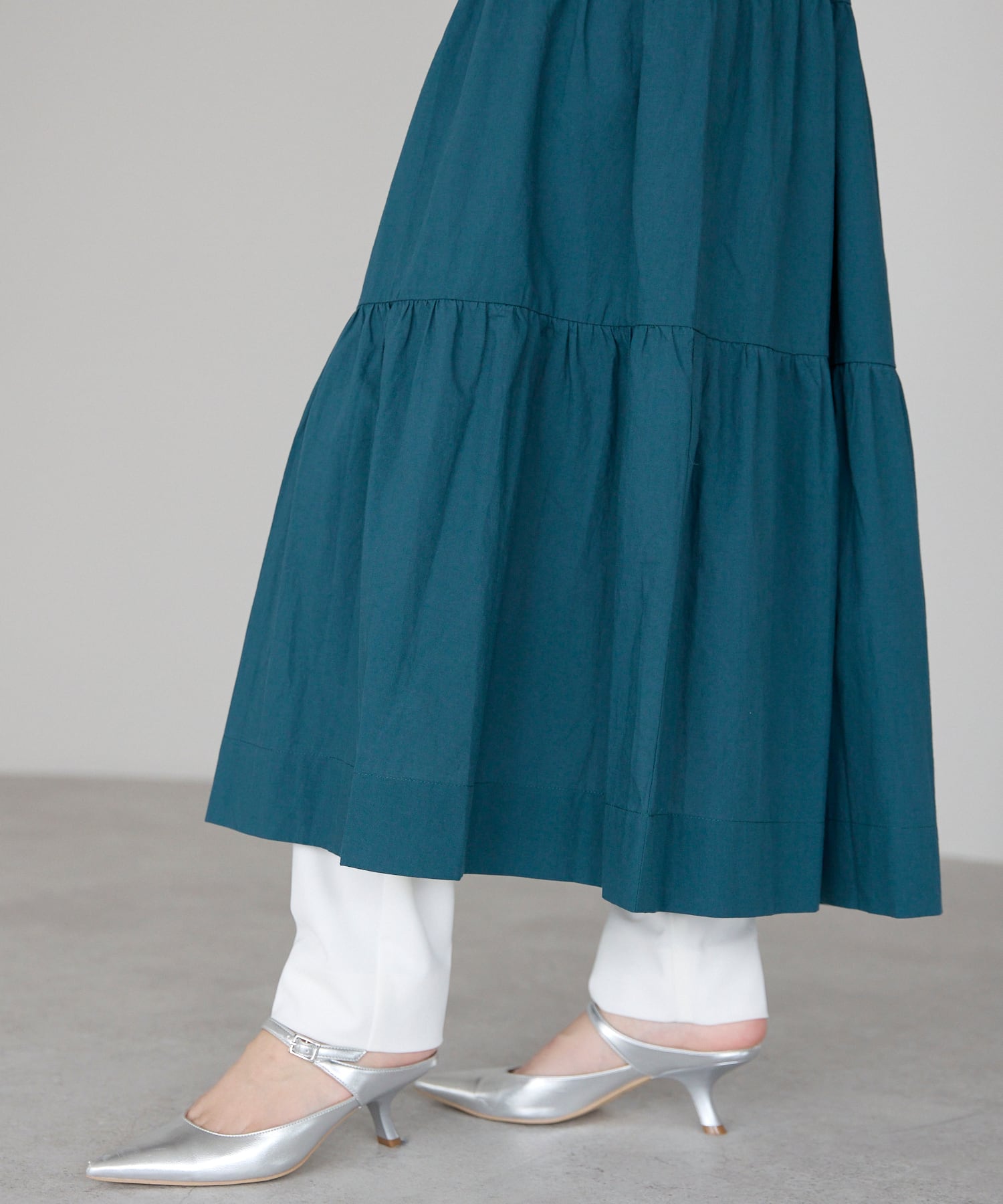 トレンドを感じさせるだけでなくギャザーの入ったティアードシルエットで体型カバーの効果も狙える一石二鳥なワンピースです。