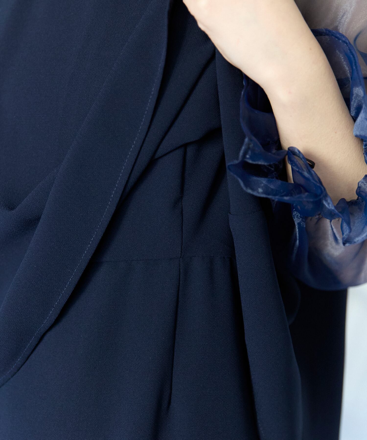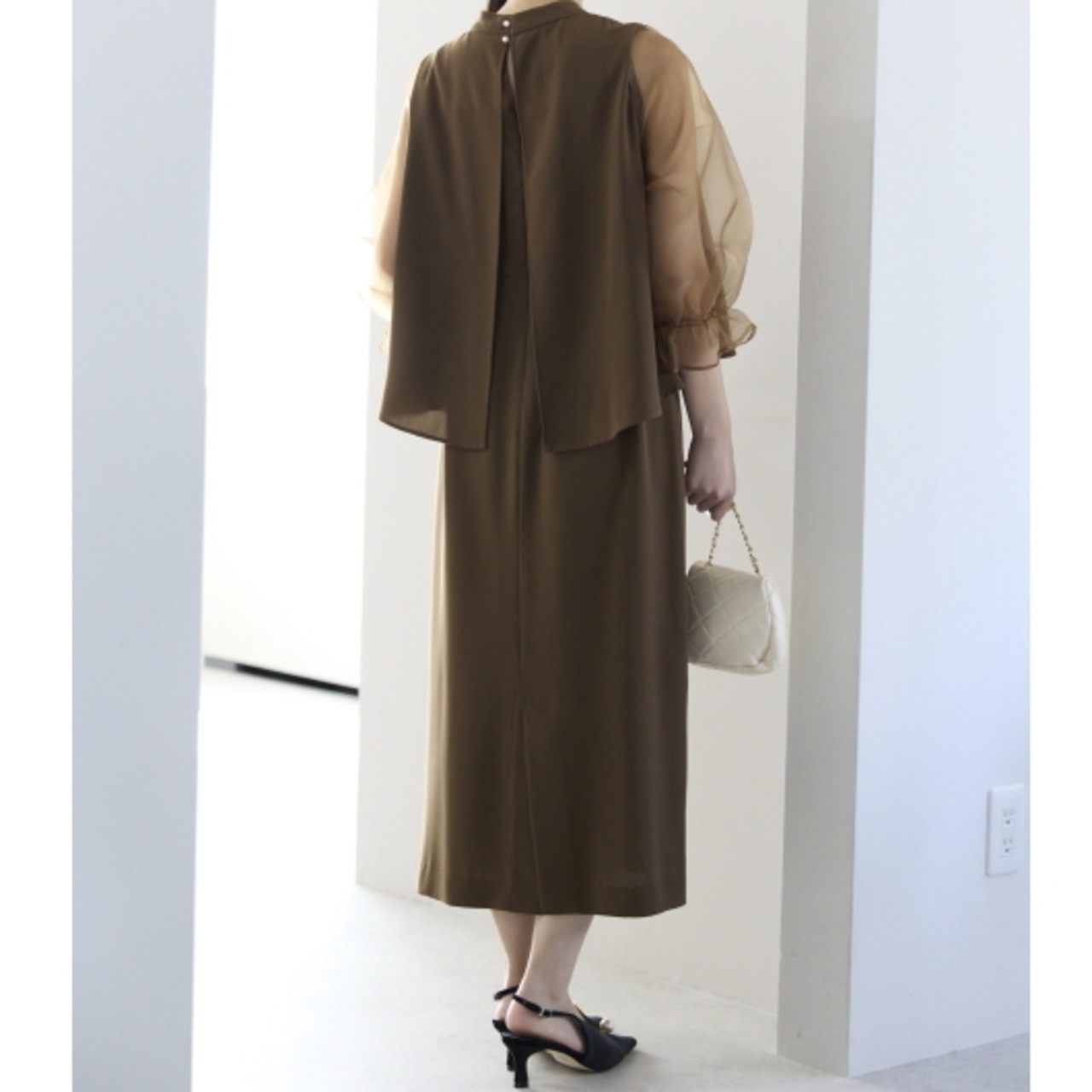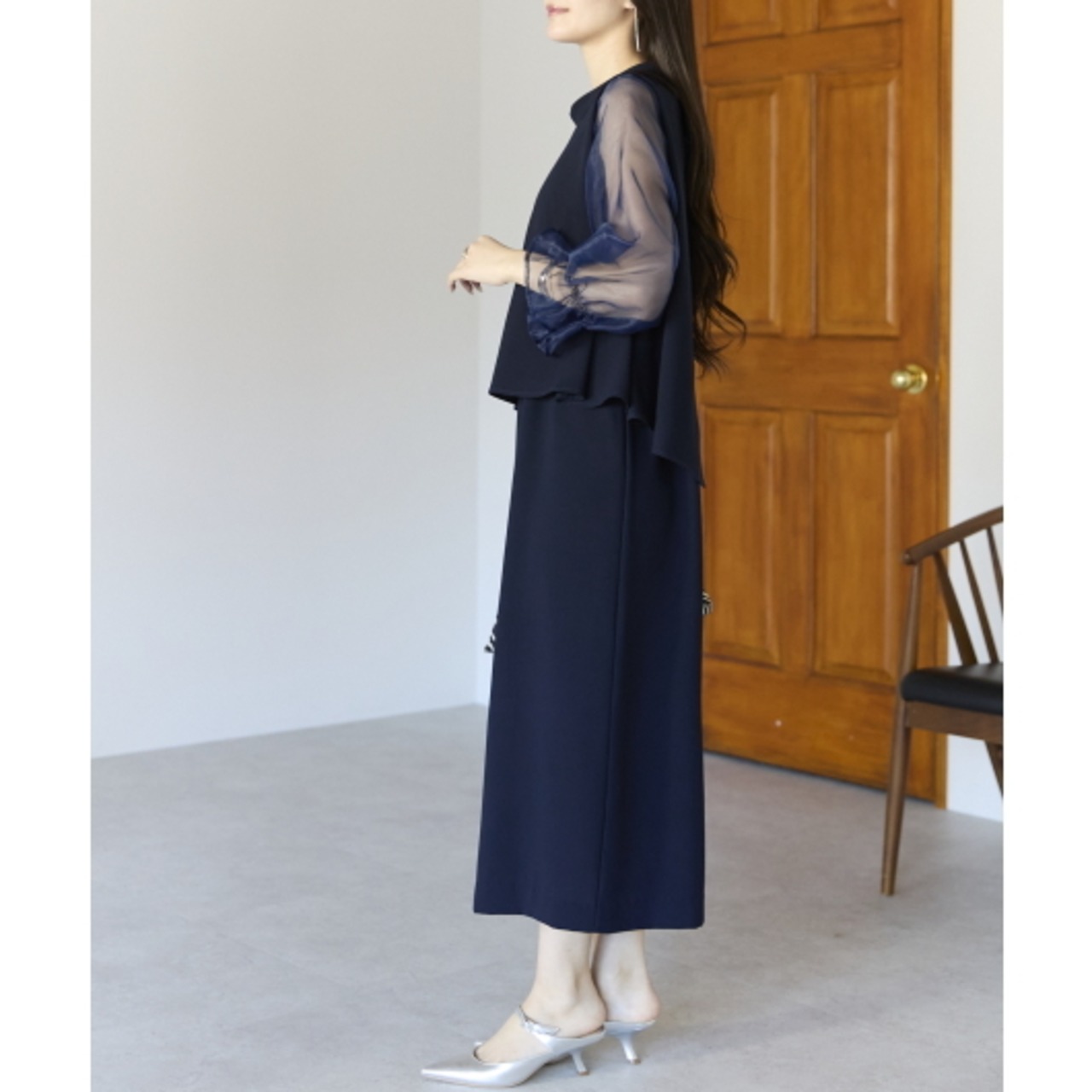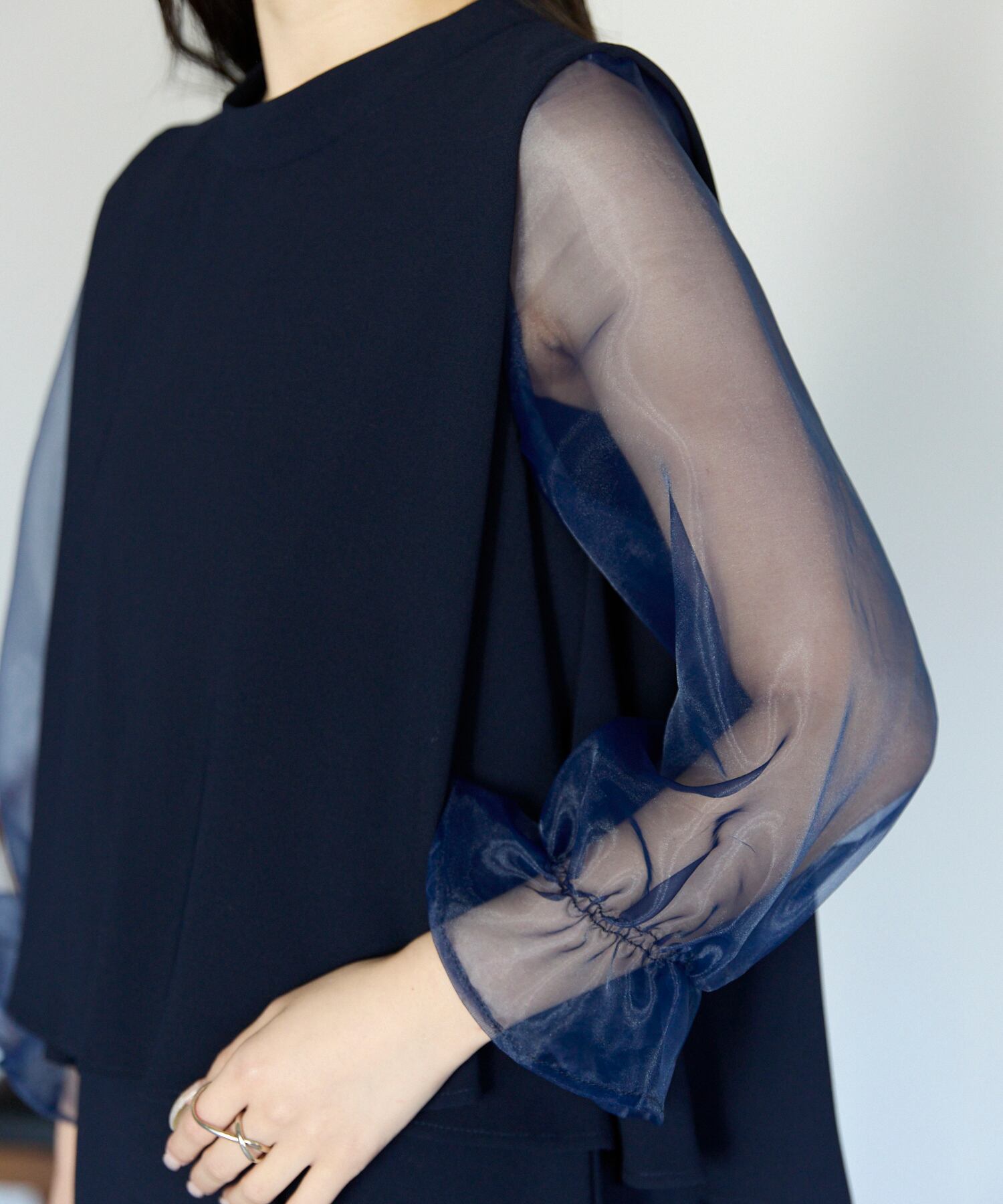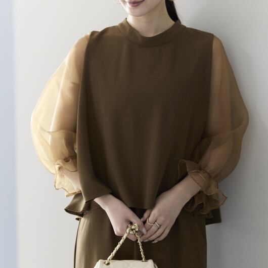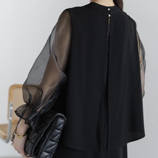 程よい透け感が女性らしさを引き立てつつ、二の腕を自然にカバーしてくれます。