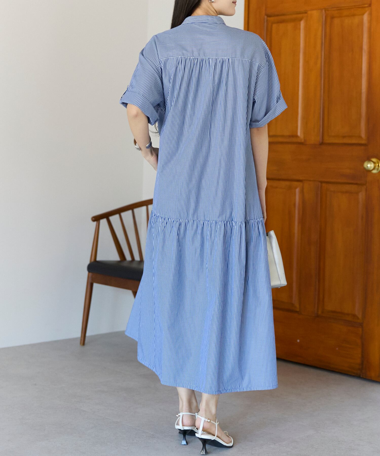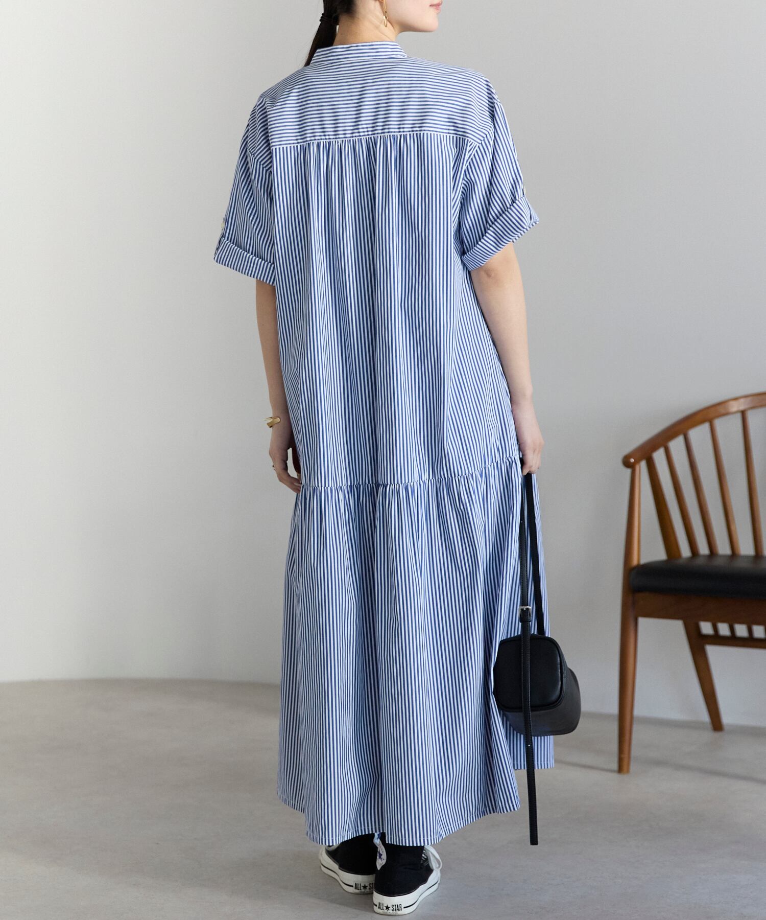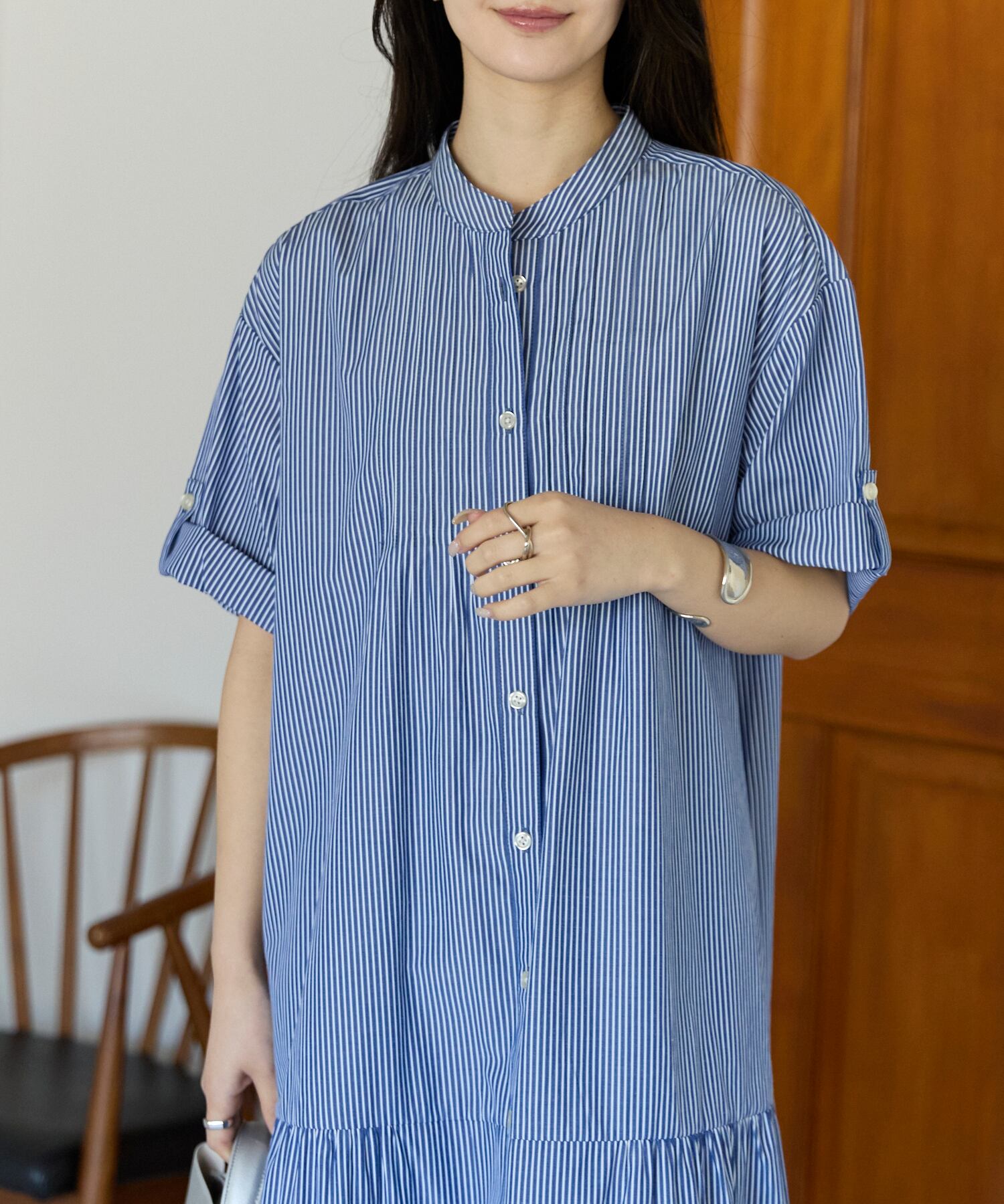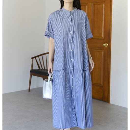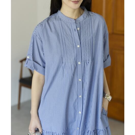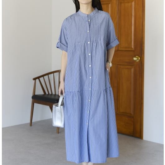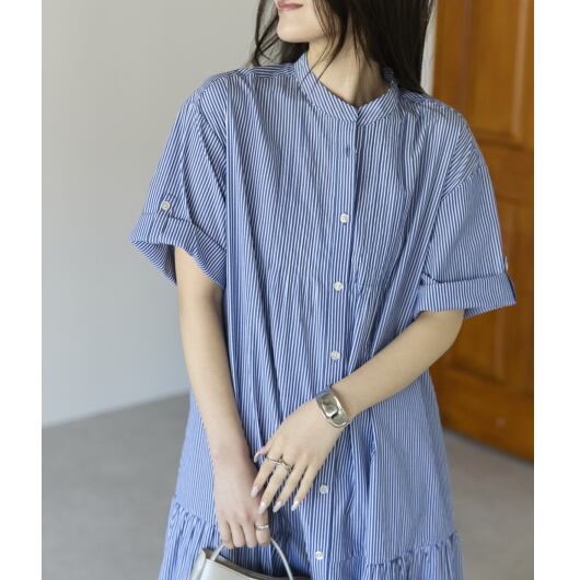ストライプティアードシャツワンピース バンドカラー(11297)