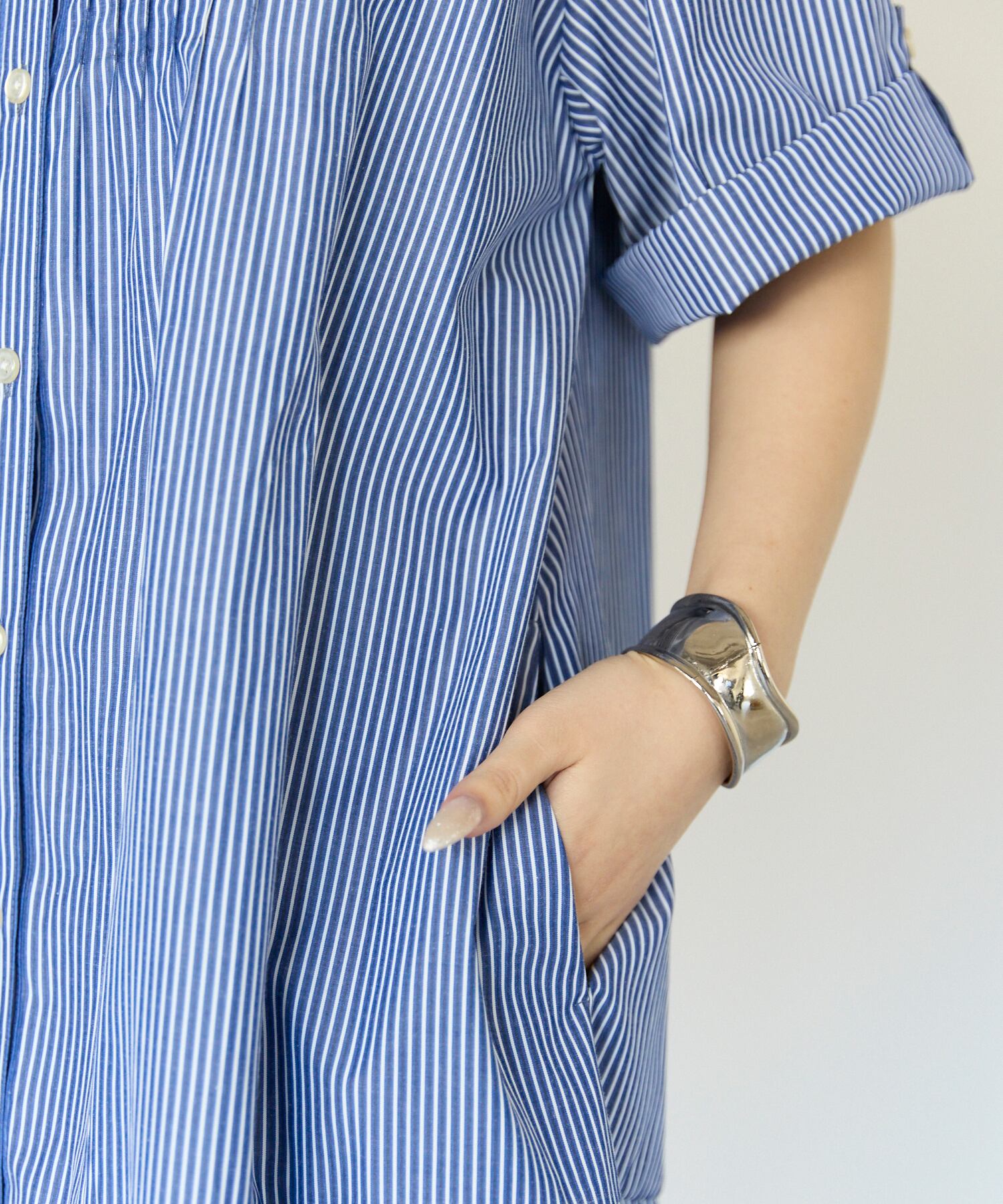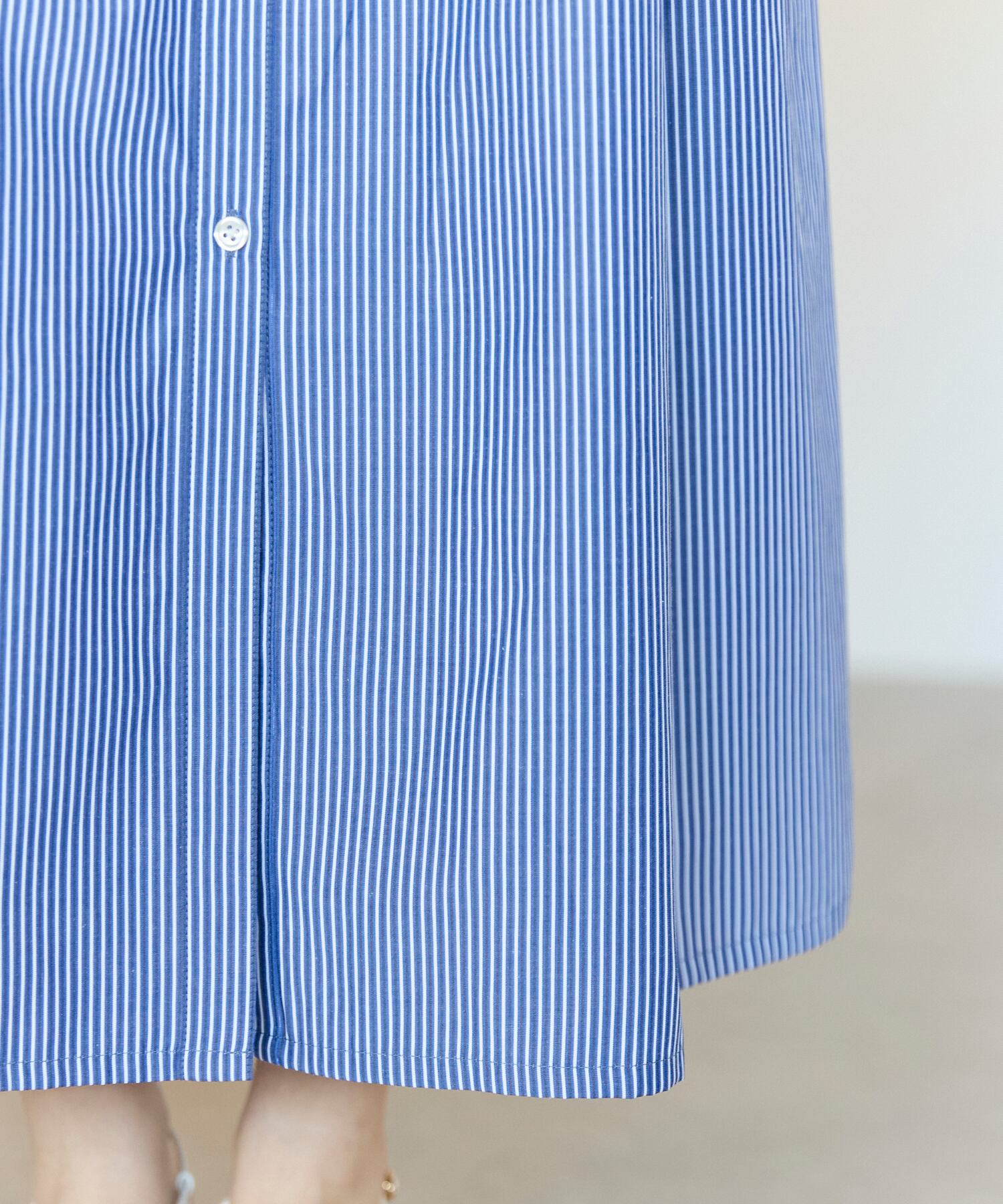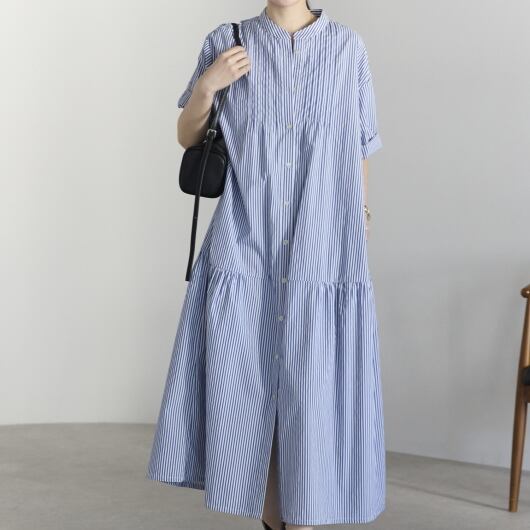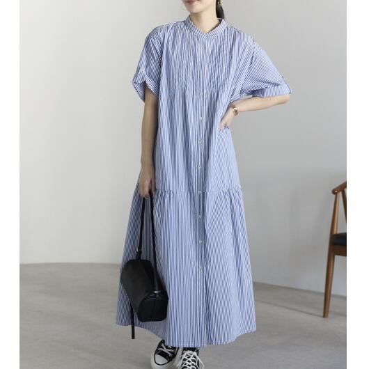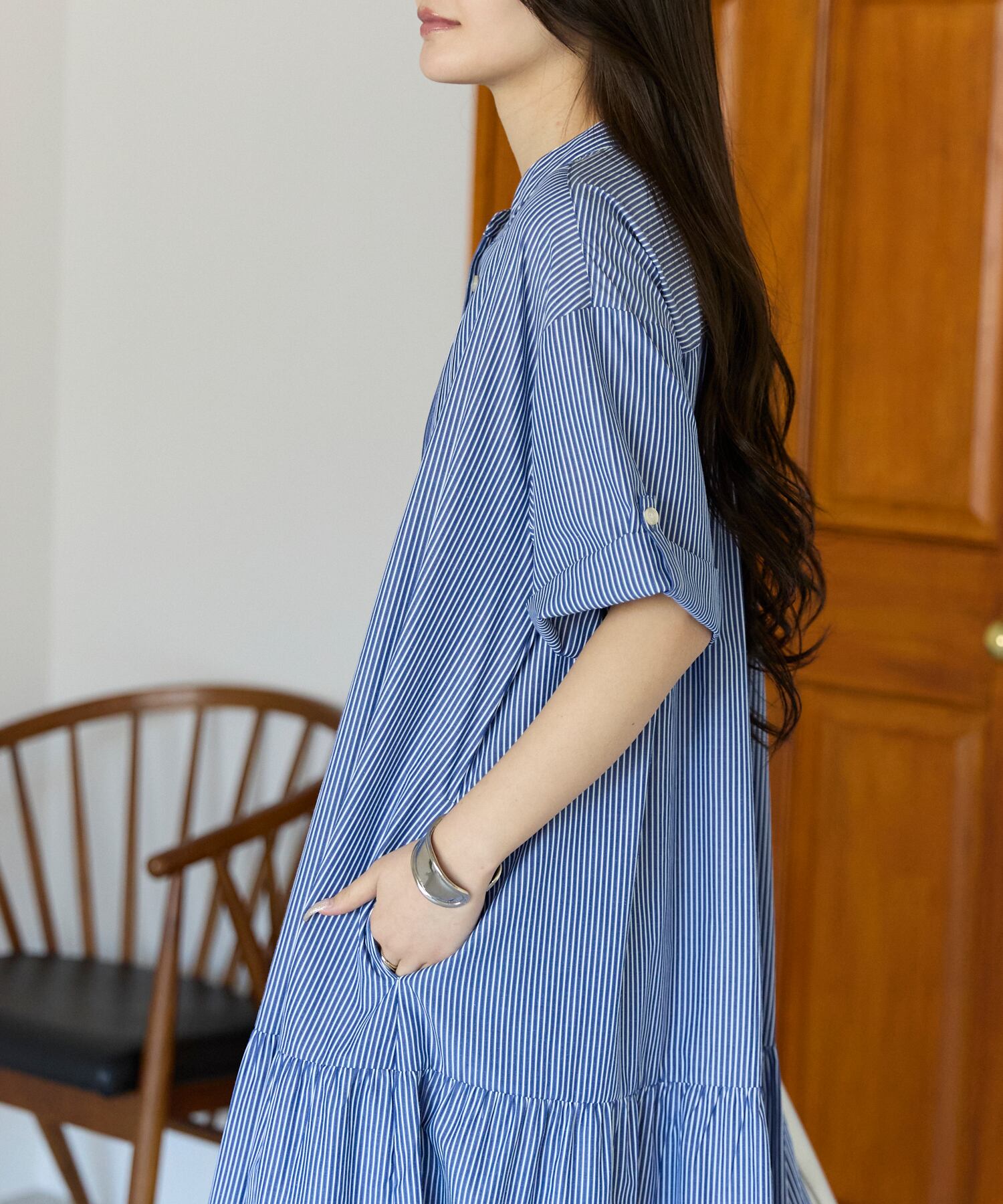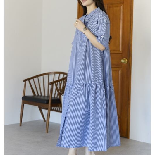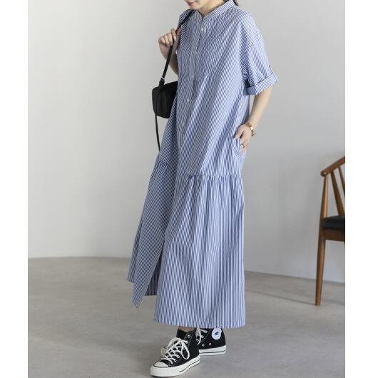 ストライプティアードシャツワンピース バンドカラー(11297)